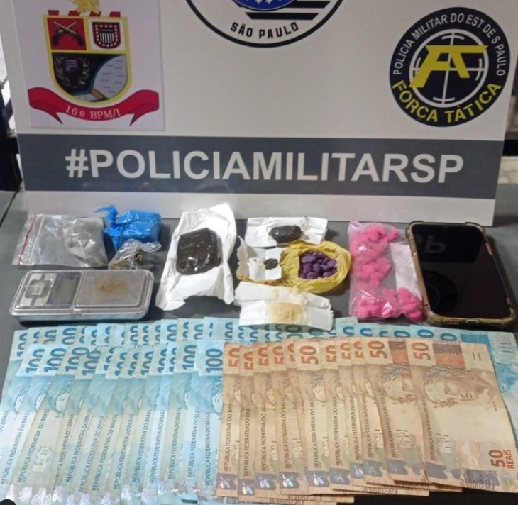 Com porções de maconha e cocaína, um celular e uma balança de precisão