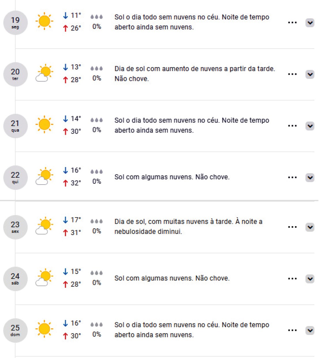 Mínima de 15º e máxima de 31º, com baixos índices de umidade do ar