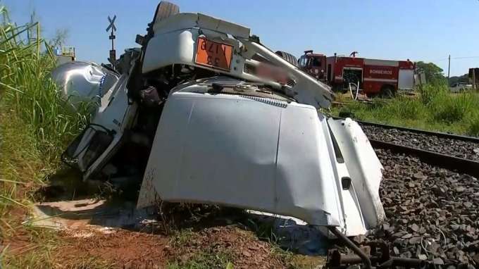 Caminhão-tanque é atingido por trem em travessia de linha férrea