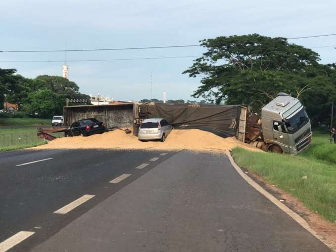 Caminhão bitrem carregado com soja tomba e provoca lentidão em rodov