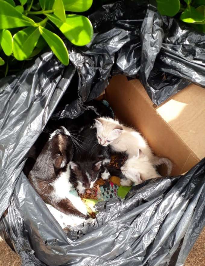 Mulher resgata gata e filhotes abandonados dentro de saco de lixo