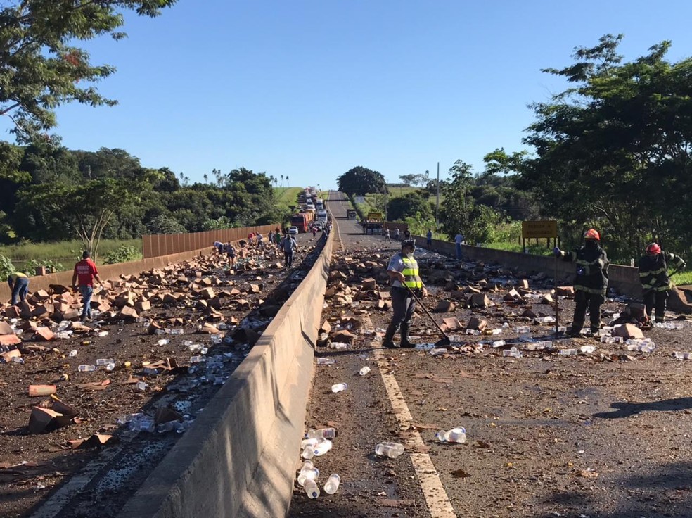 Caminhão de bebidas tomba e interdita rodovia da região
