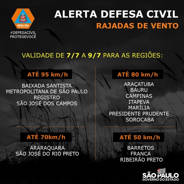 Defesa Civil emite alerta para rajadas de vento em todo o estado de SP