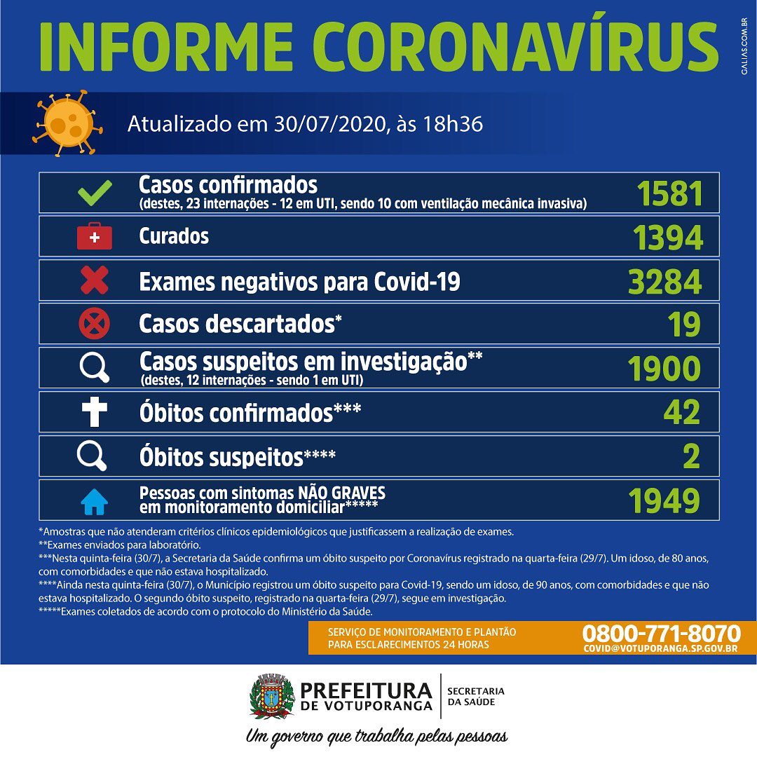 Votuporanga tem agora 1.581 casos confirmados, com 1.394 curados