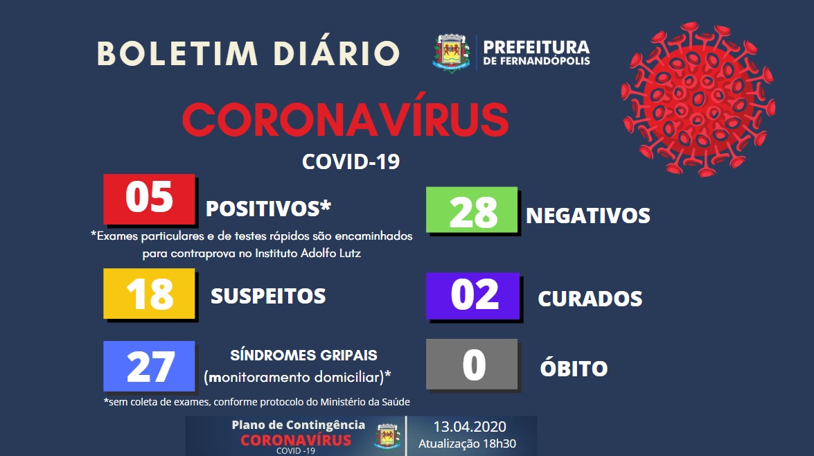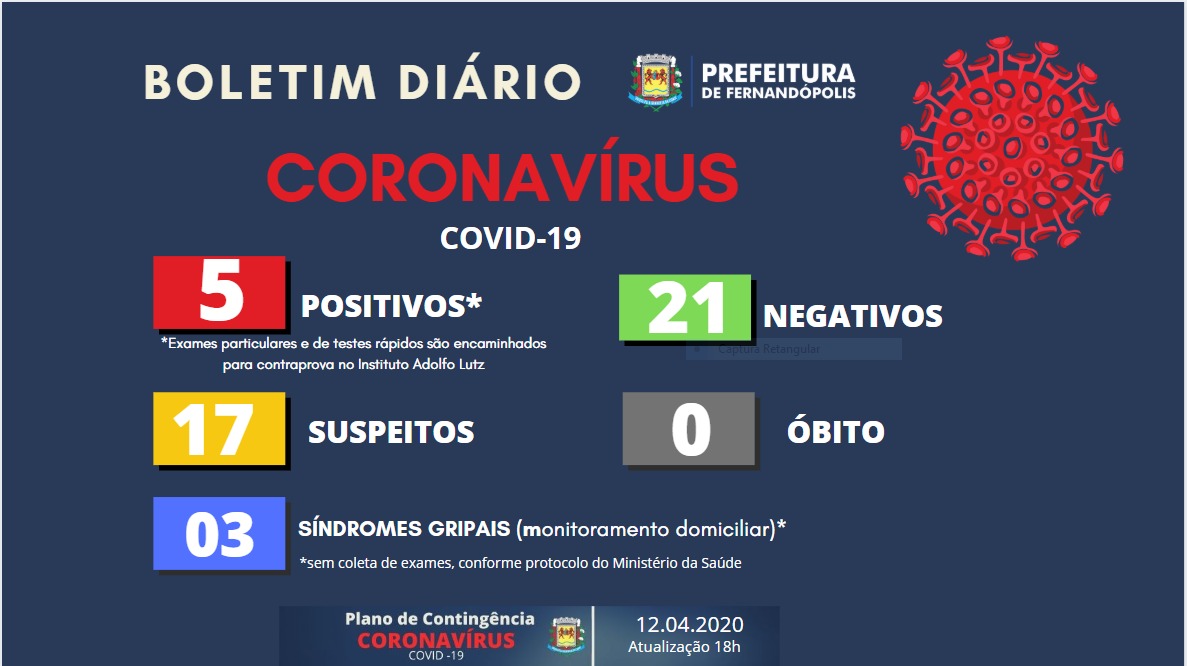 Boletim epidemiológico tem cinco casos positivos e 19 negativos