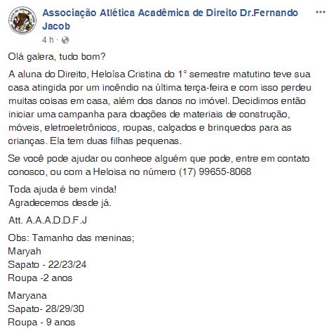 Atlética de Direito se mobiliza para arrecadar doações para famíli