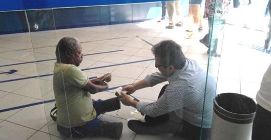 Gerente da Caixa senta-se no chão para atender homem com deficiência