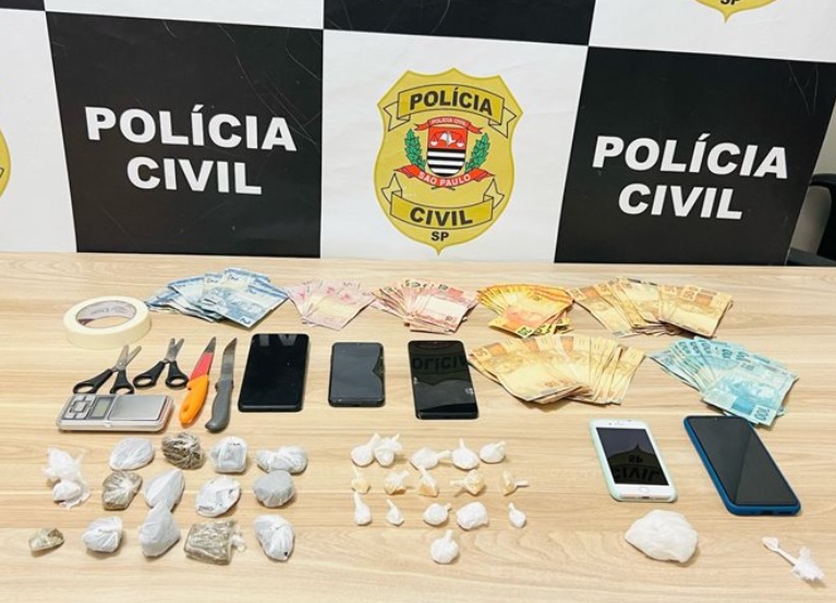 E apreenderam entorpecentes, dinheiro e objetos relacionados ao crime