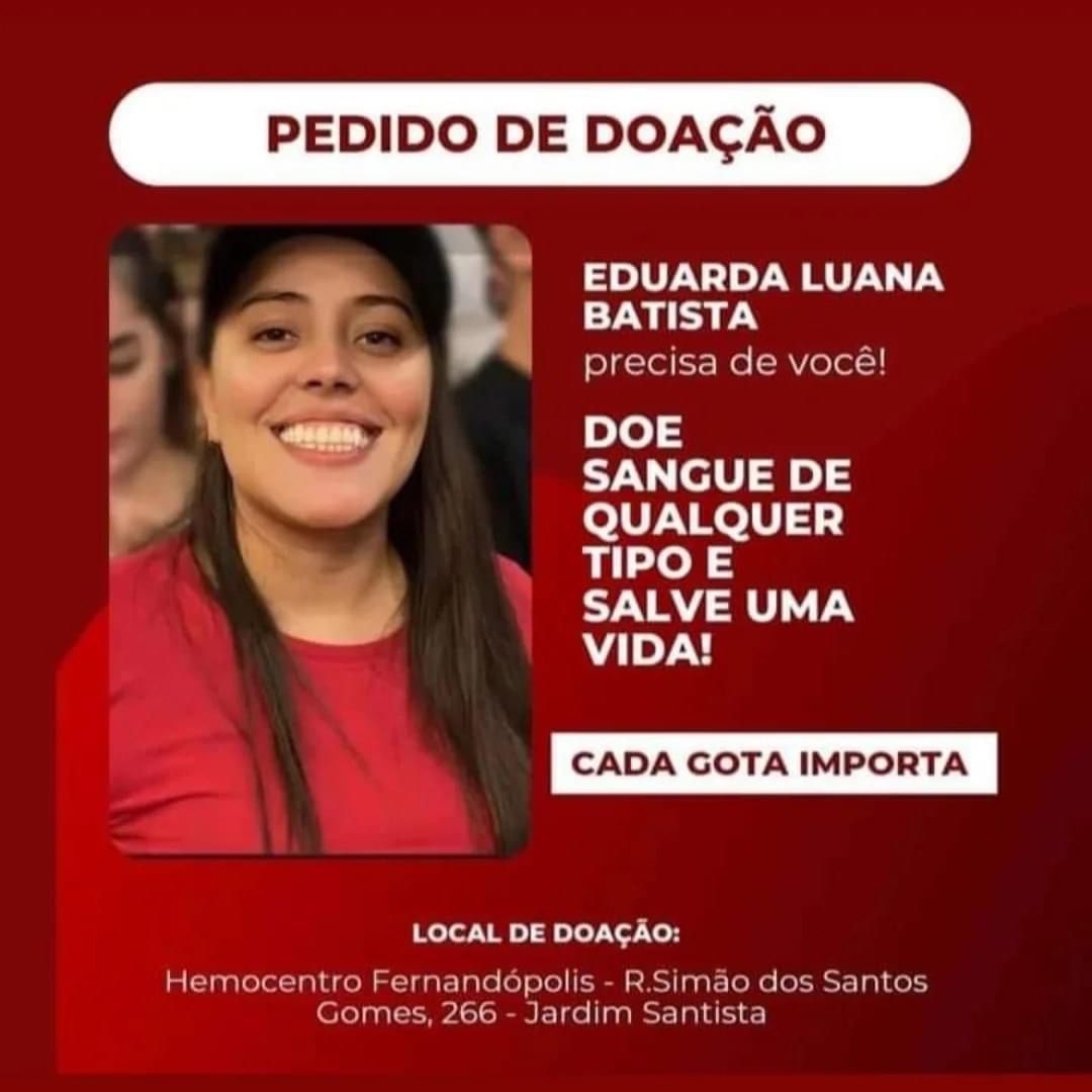 As doações para Eduarda podem ser feitas no Hemocentro de Fernandópolis