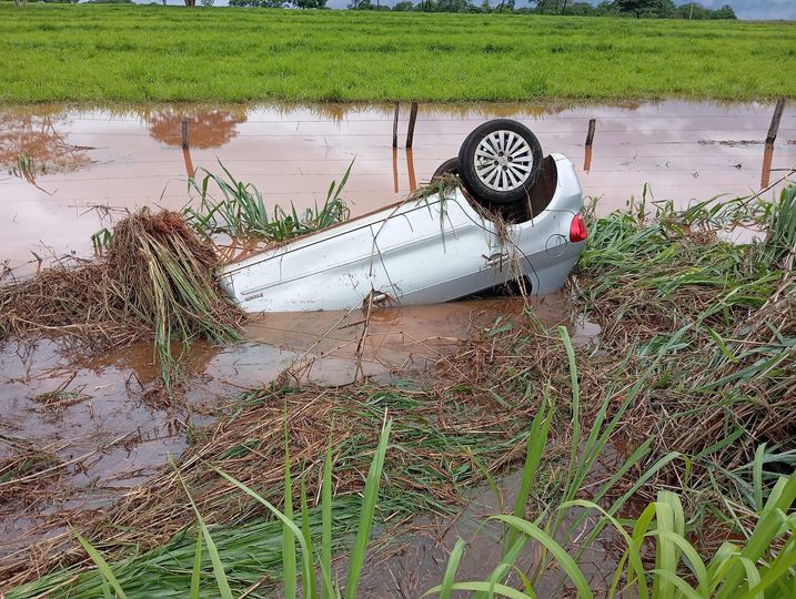 Imagem do acidente impressiona: carro capotou em área de alagamento