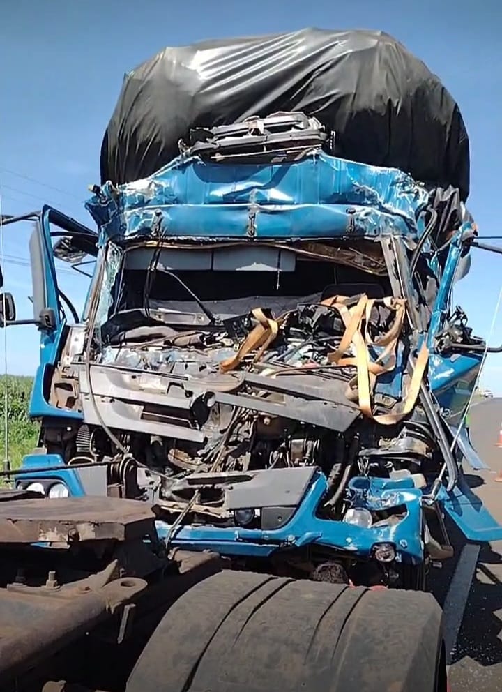 Cabine do caminhão ficou destruída em acidente com outro caminhão