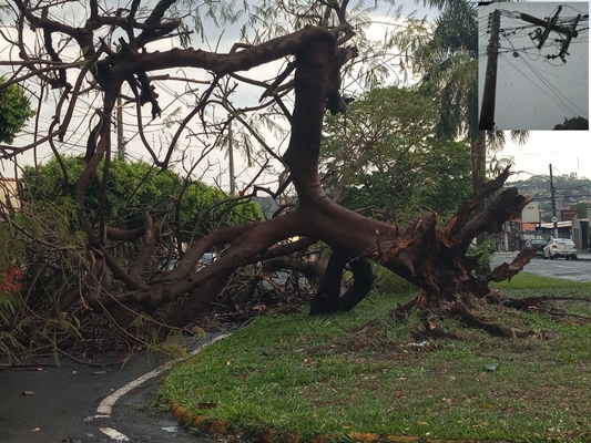 Árvore e poste caem sobre veículos em Votuporanga após tempestade