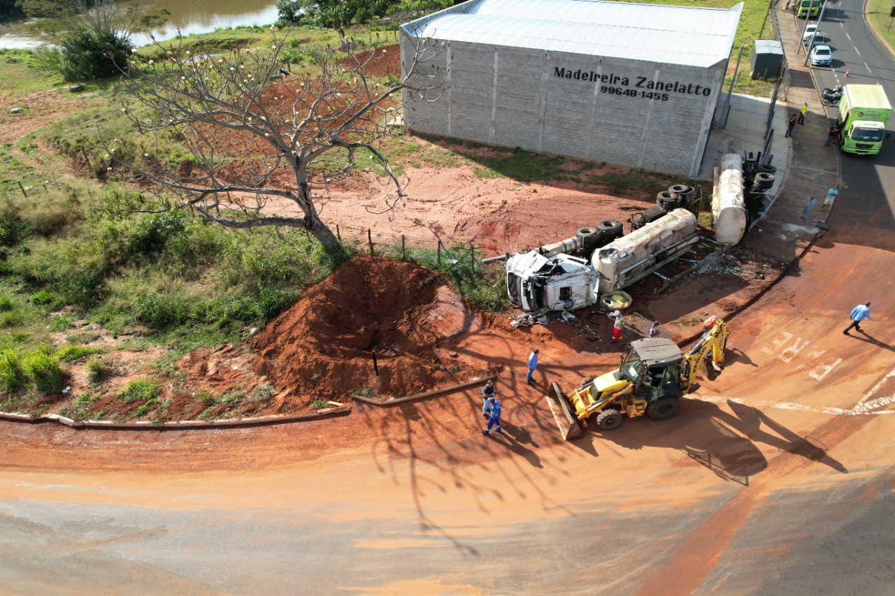Prefeitura trabalha para conter óleo que vazou de caminhão tombado